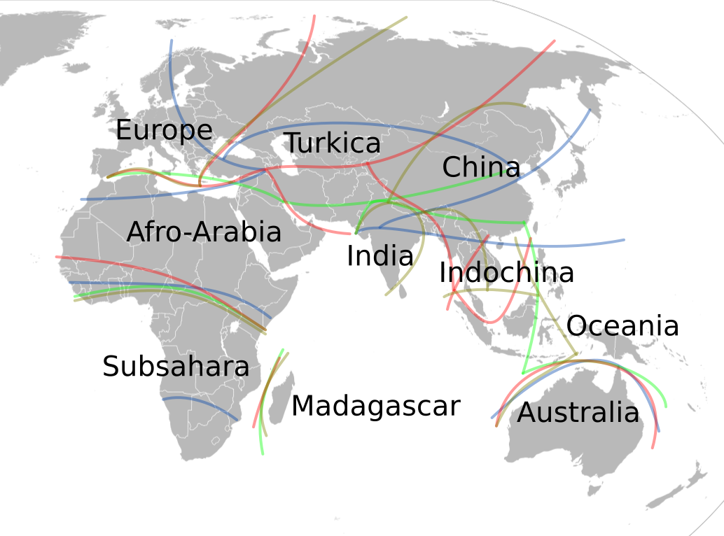One possible arrangement of continents. Borders are necessarily fuzzy.